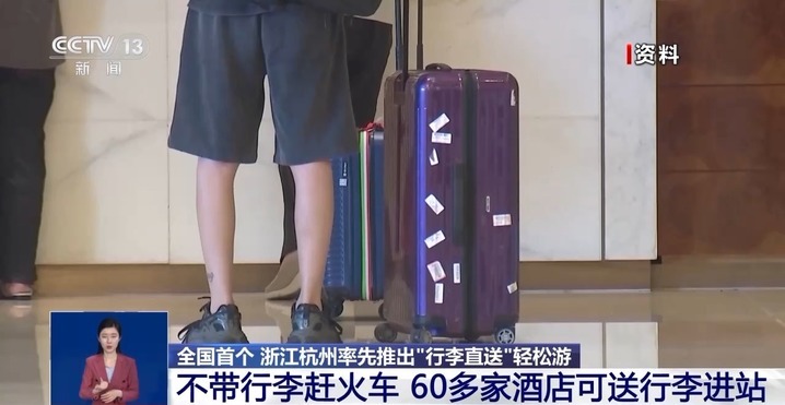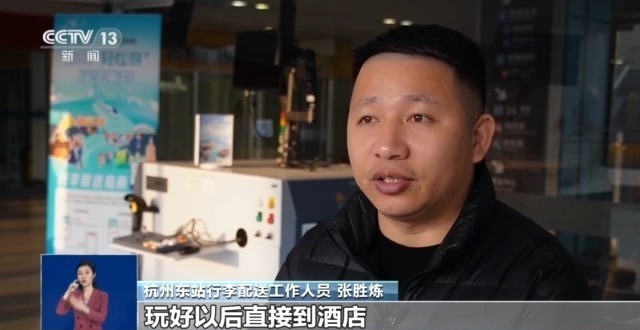 杭州东站行李配送工作人员 张胜炼:把行李交给我们,直接可以把它送到酒店,你可以去别的地方玩,玩好以后直接到酒店,这个时候行李就已经送到你的前台了。